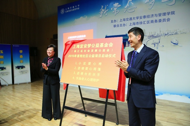 上海宜安夢公益基金會2015年首批社區公益項目正式啟動 論壇結束后,蔣東良董事長主持了上海交大安泰EMBA校友會與上海市徐匯商務委員會的戰略合作簽約儀式。隨后,由宜興市工業設備安裝有限公司出資設立的上海宜安夢公益基金會2015年首批社區公益項目正式啟動,上海市工商行政管理局局長陳學軍與徐匯區委副書記王醇晨為啟動儀式共同揭牌。 |